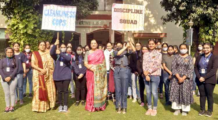 Jalandhar, November 22, 2021: Kanya Maha Vidyalaya (Autonomous) has always made a concerted effort to inculcate moral values in the students. In an another new initiative, KMV organised investiture ceremony of Discipline Squad and Cleanliness Cops. The initiative was done under the aegis of Student Welfare Department of the college. These committees have been established with the aim of inculcating the virtues of discipline in the students and motivating them to go ahead with hard work and dedication to achieve the goals in life as well as to ensure cleanliness of college campus and its surroundings & keeping the environment clean & green. Principal Prof. Atima Sharma Dwivedi addressing the occasion, explained to all the students about the importance of discipline in life and described it as the first step of success. She also highlighted the work done by Kanya Maha Vidyalaya from time to time for cleanliness and maintenance of the environment. She averred that more efforts will also be made to spread awareness in the society regarding the cleanliness. On the occasion, all the students who are a part of the discipline squad & cleanliness cops also took an oath to perform their service diligently. Madam Principal lauded the efforts of Dr Madhumeet, Dean, Department of Student Welfare for this wonderful initiative.