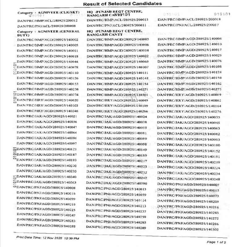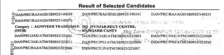 Jalandhar: 26 Nov 2025: UHQ Agniveer recruitment rally for recruiting year 2025-26 for Agniveer GD, Agniveer Clerk & Tradesmen 10th was conducted at Mamun Cantt, Pathankot wef 19 Aug 2025 to 22 Aug 2025. The Common Entrance Examination (CEE) for the said rally was held on 28 Sep 2025 at The Punjab Regimental Centre.